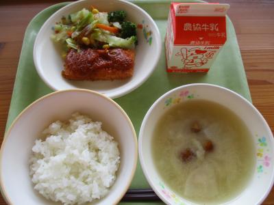 今日の献立は「ごはん、魚のマヨネーズ焼き、きんぴらごぼう、じゃがいもとわかめのみそ汁、牛乳」です。