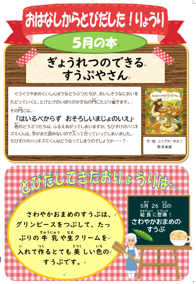 今月のお話しから飛び出した料理は「ぎょうれつのできるスープやさん」です。