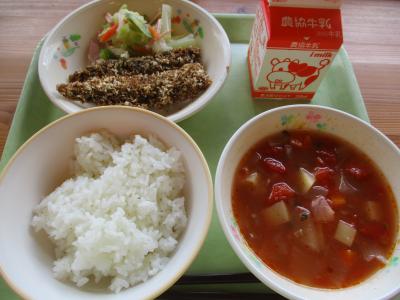 今日の献立は「ごはん、いわしのアングレース、アスパラガスのサラダ、ミネストローネ、牛乳」です。