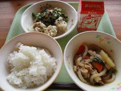 今日の献立は「中華おこわ、バンサンスー、たまごとわかめのスープ、ヨーグルト、牛乳」です。