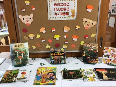 図書館前の特集コーナーはきのこです。きのこに関する本がいろいろあるんですね。