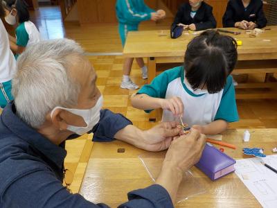 吉野工芸の里で活動する作家の方を学校に招き、創作活動を通して地域のよさや活躍している人の存在を知る感性のびのび体験を行っています。小学校1年から6年までが縦割りで分かれ、木のカスタネット、木のモービル、和紙の飾り箱、ガラスツリーを作っています。児童たちが色々な人と交流して学ぶ姿が見られます。