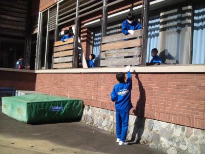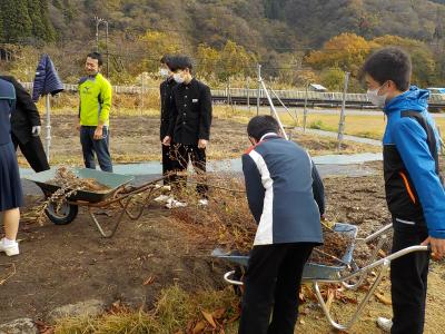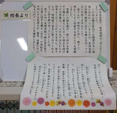 中学生全員で雪囲いやネットを校舎周りに設置しています。中学生のがんばりのおかげで、雪の備えができています。