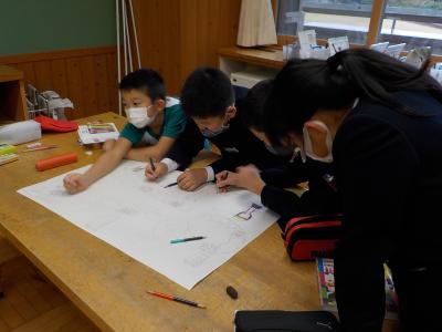 白嶺小、白峰小、河内小、鳥越小の5・6年生が本校に集まり、ぶんぶんボウルによるSDGsの学習会を行っています。住み続けられる町づくりのために、お祭り、料理、ロボット、芸能人という各キーワードから、何ができるのか、何人かがアイディアを発表しました。楽しみながらSDGsについて知る機会となっています。