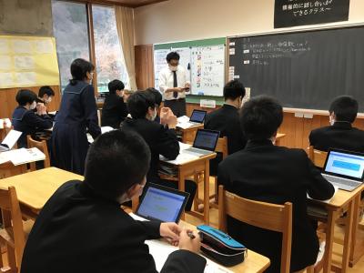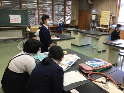 理科 火山の構造や噴火のタイプなど、各自が調べた火山のことについて発表しています。