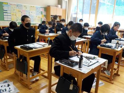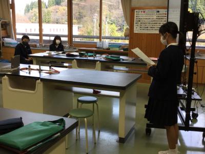 立志式 鳥越中学校の2年生と合同で立志式を行っています。本校の生徒が代表して市民憲章、立志の言葉を言っています。式の後、講演会も行われます。