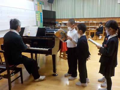 音楽 「ゆうやけこやけ」を歌います。自分がイメージする夕焼けを伝え合い、曲に合った歌い方を工夫して歌っています。