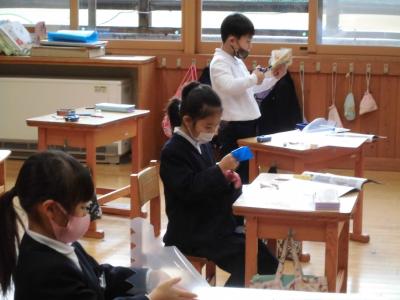 図工 粘土の仕上げとして、色を塗った後、ニスを塗っています。