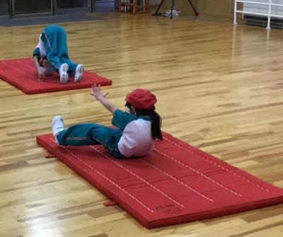 体育 開脚前転を練習しています。先生のお手本を見てから実践しています。