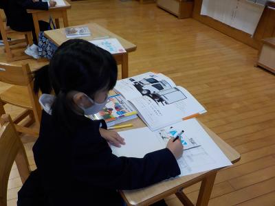 国語 教科書の「じどう車くらべ」を学習し、自分で自動車を調べ、まとめています。