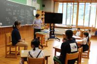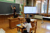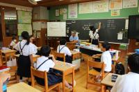 1年 算数「どちらがおおい」 2つの入れ物に入る水のかさを比べる方法を考えています。研究授業として行われたので校内の先生方も参観しました。1年生は自分の考えを友達に説明したり、ノートにふり返りを書いたり、最後まで一生懸命取り組んでいました。