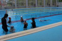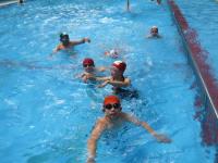 1・2年 体育 1年生は水に浮かんだり潜ったりする練習をしています。2年生はビート板を使って泳ぐ練習です。