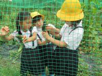 1年 生活科 畑の野菜を収穫しました。大きなキュウリがとれました。ミントの葉もよい香りでした。