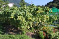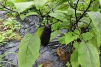 ひまわりも草たけがずいぶん伸びました。大きなナスもあります。