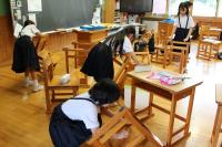 5年 1学期最終日、机や椅子の裏のほこりを掃除します。