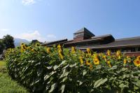 青空の下、ひまわりの花は元気に咲きそろいました。学校は明日から閉庁期間となります。
