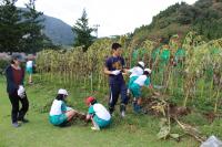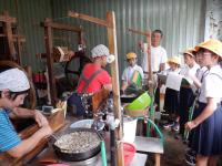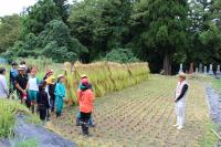 5月9日に田植えをした田んぼで、稲刈りをしました。刈った稲は束ねてワラで縛り、稲架がけをします。慣れない作業もだんだんと上手になり、約1時間で終えることができました。暑くて大変でしたが、農家の方のご厚意でスイカをいただき、みんな大喜びでした。