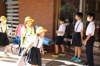 「育友会あいさつ運動」 週初めから、保護者の方々が学校玄関や各地区のバス停であいさつ運動を行いました。