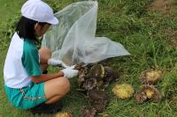 渡りのチョウ、アサギマダラが校庭に咲いているフジバカマの花にやってきています。羽根にマーキングをして再び空へ…「元気でね!」