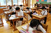 5年 書写 硬筆の練習。手本を見ながら、よい姿勢でていねいに書いています。