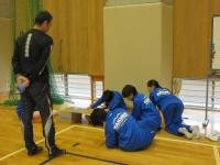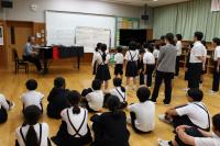 中学生の激励会に向けて、小学生が全校で応援団をつくりかけ声や手拍子などの練習をしています。