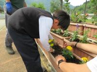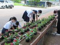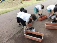 <小学校> 花の苗植え 5限目に校長先生にこつを教えてもらいながら、みんなで苗に「がんばろう!」と声をかけながら丁寧に植えました。
