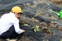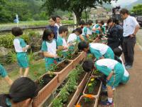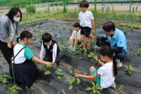 1・2年生 野菜の苗を畑とプランターに植えました。