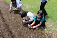「福島ひまわり里親プロジェクト」 校舎前の花壇にヒマワリの種をまきました。全校で育てて、秋には種の収穫まで行う予定です。