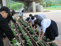 昼休み ニチニチソウの苗植えをみんなで協力して行いました。きれいに咲くといいですね。