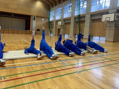 体育 いろいろな技を盛り込んで、マット運動の発表を行っています。
