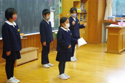 5年生からは「廊下を走らない」「信号が点滅したら渡らない」など、学校内外での安全について国語の時間にまとめたことを元に発表しています。