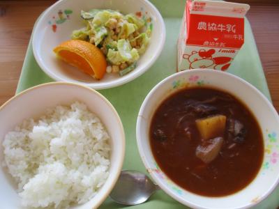 今日の献立は、お話から飛び出した料理「ご飯、牛乳、ビーフシチュー、シーザーサラダ、デコポン」です。