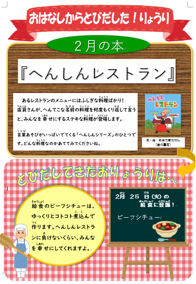 本の題名は「へんしんレストラン」です。このレストランのメニューはへんてこな名前の料理ばかり。このへんてこな名前を何度もくり返して言うと、みんなを幸せにするステキな料理が登場します。
