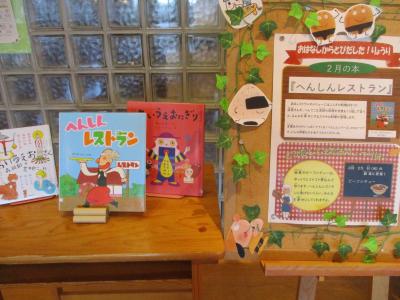 給食をきっかけに本を手にとってくれたらと思い、司書の先生のご協力でランチルームに関連本とともに展示をしています