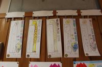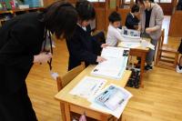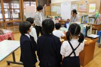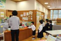 1年 「図書館オリエンテーション」 本の借り方を習いました。担任の先生がお手本になっています。