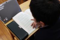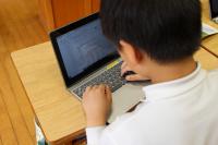 4年 道徳「どっちがいいか」 資料を読んで自分の考えを端末に入力しています。