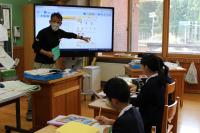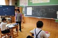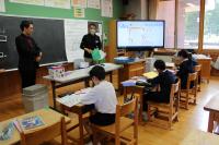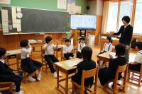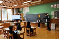 6年 社会「オリエンテーション」 6年生の社会科は中学校の先生が担当します。先生の自己紹介の後、6年生が先生の好きなものについていろいろ質問しています。
