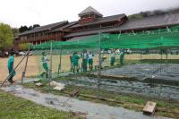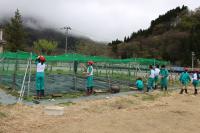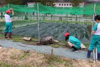 〈小学校〉 5・6年生が学校農園で畝作りやマルチかけをしました。防獣ネットを設置する準備も行いました。ちょうど1・2年が生活科の校外学習で通りがかり、「ありがとう!」「がんばってね」と応援してくれました。5・6年生は桜の花びらが舞う中、全校のみんなのために一生懸命作業をしてくれました。