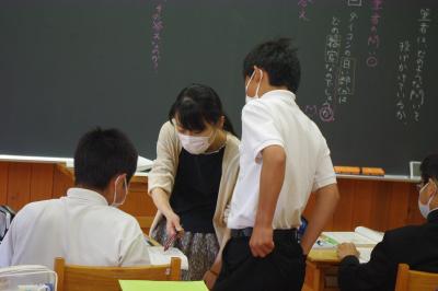 今年度の研究の重点である「まとめふりかえりの充実」に向けて、先生たちが中学校1年国語の授業を参観し、まとめふりかえりの充実のためにどうすればよいかを話し合っています。