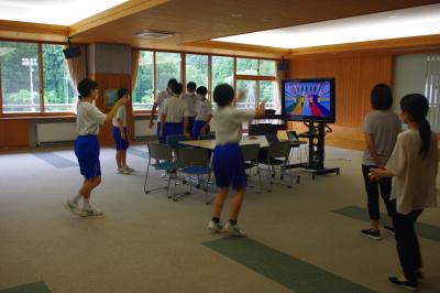 総合的な学習の時間 白山ろく少年自然の家で明日行う5年生の集合学習のリハーサルを行っています。白嶺小学校について他校に紹介します。マラソン記録会や中学生への激励など、学校の特徴を紹介します。