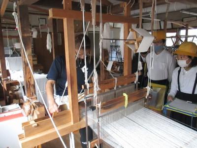 国語・社会 牛首つむぎについて学ぶため、白峰の白山工房を訪問しています。カイコから糸を取り出し、織っていく工程を見学しています。