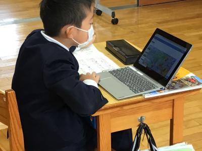 図工 1年生を招待して楽しんでもらうおもちゃランドをつくるために、どんなおもちゃを作るのかを話し合っています。招待することはしばらく秘密にしておくそうです。