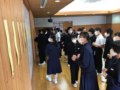 国語 市の事業「感性のびのび俳句大会」に出品する俳句を作っています。作り終えたら、作者を伏せた作品一覧の中から、各自気に入ったものに票を投じます。票が多かった作品は、作者が意図を説明したり、投票者がよかったところを伝えたりしています。