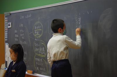 理科 塩や砂糖を水に溶かす実験をしています。水温と溶ける量の相関に注目しています。