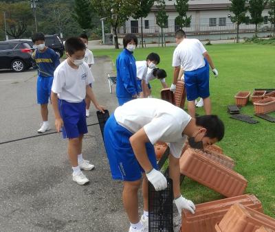 花いっぱい運動で地域の方に育ててもらった花を回収し、プランターの清掃をしています。育ててくださった方々にお礼を言いました。