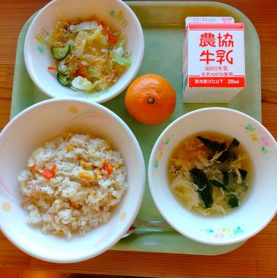 12/6 今日の給食 投稿日時 : 2023/12/06 hakurei 今日の献立は、「チャーハン・牛乳・じゃこサラダ・コーンかきたまスープ・みかん」です。じゃこサラダには、カリカリにしたちりめんじゃこと春巻きの皮をカットして油で揚げたものを混ぜ込みました。カリカリの歯ざわりがおいしかったです。