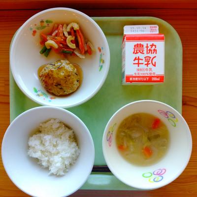 10/18 今日の給食 投稿日時 : 2023/10/19 hakurei 今日の献立は、「ごはん・牛乳・豆腐ハンバーグ・にんじんのきんぴら・白菜のみそ汁」です。豆腐ハンバーグは給食室で手作りしました。ひじきがたっぷりです。やわらかく出来上がるので、いつものハンバーグとは違った味わいです。
