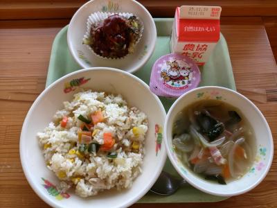 今日の献立は「クリスマスピラフ、ミートローフ、オニオンスープ、デザート、牛乳」です。