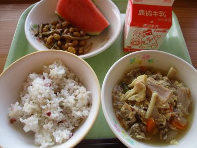 今日の献立は「梅こんぶごはん、大豆とごぼうのごまからめ、車麩の卵とじ、小玉すいか」です。