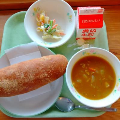 今日の献立は、「きな粉あげパン・牛乳・フレンチサラダ・カレーシチュー・チーズ」です。